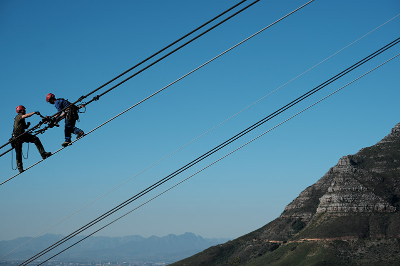 A modern cableway is a complex system with diverse components which have varying maintenance requirements and replacement cycles. Apart from the general inherent mechanical demands of such systems, the location of the Table Mountain Cableway with aggravating factors such as the Cape Doctor’s gusting winds, the moist environment from clouds billowing over the mountainside, and the corrosive effects of the neighbouring Atlantic all contribute to its intensive maintenance programme.