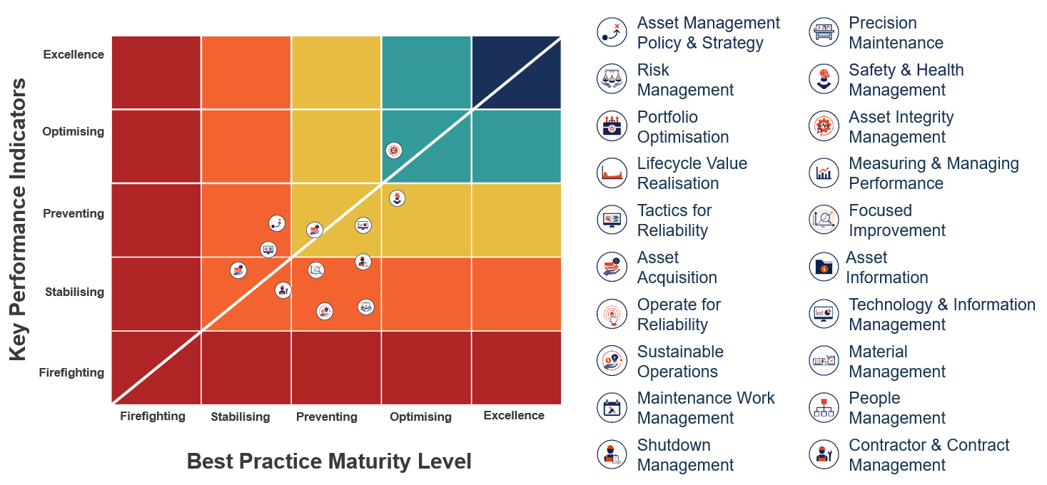 The assessment involves an evaluation of requested material, an on-site tour and interviews with role players and the verification of the information provided during interviews. Our engineers use our own proprietary software tool, Assessor, to perform and record the assessment scoring. Unlike one-dimensional assessments, Assessor measures an organisation’s asset management maturity using two quadrants, namely the Best Practice Maturity Level and Key Performance Indicators (KPIs). All role players partake in the consensus mapping (best practices and KPI verification points) and scoring.