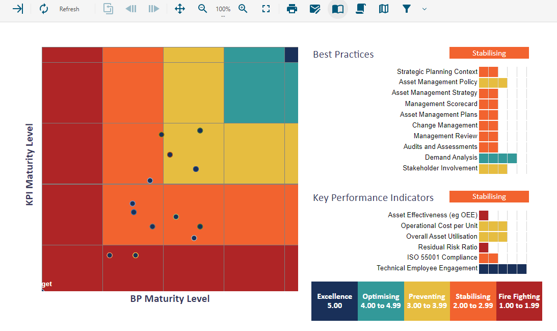 The assessment involves an evaluation of requested material, an on-site tour and interviews with role players and the verification of the information provided during interviews. Our engineers use our own proprietary software tool, Assessor, to perform and record the assessment scoring. Unlike one-dimensional assessments, Assessor measures an organisation’s asset management maturity using two quadrants, namely the Best Practice Maturity Level and Key Performance Indicators (KPIs). All role players partake in the consensus mapping (best practices and KPI verification points) and scoring.