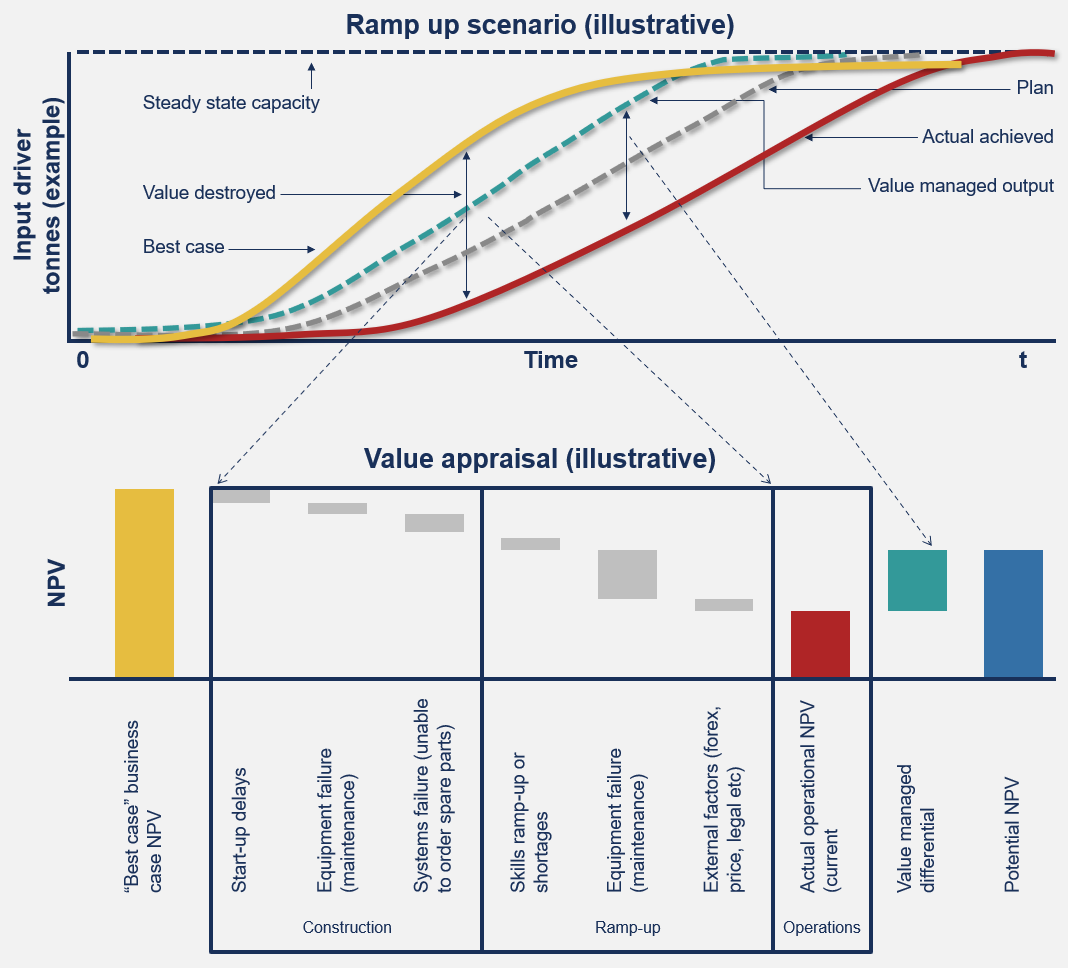 Certain case studies illustrated that up to 30% of the initial study value has been destroyed. (Illustrated in the graph alongside.) [Source: Adapted from Deloitte, 2012. Effective Operational Readiness of Large Mining Capital Projects – Avoiding value leakage in the transition from project execution into operations. Article.]