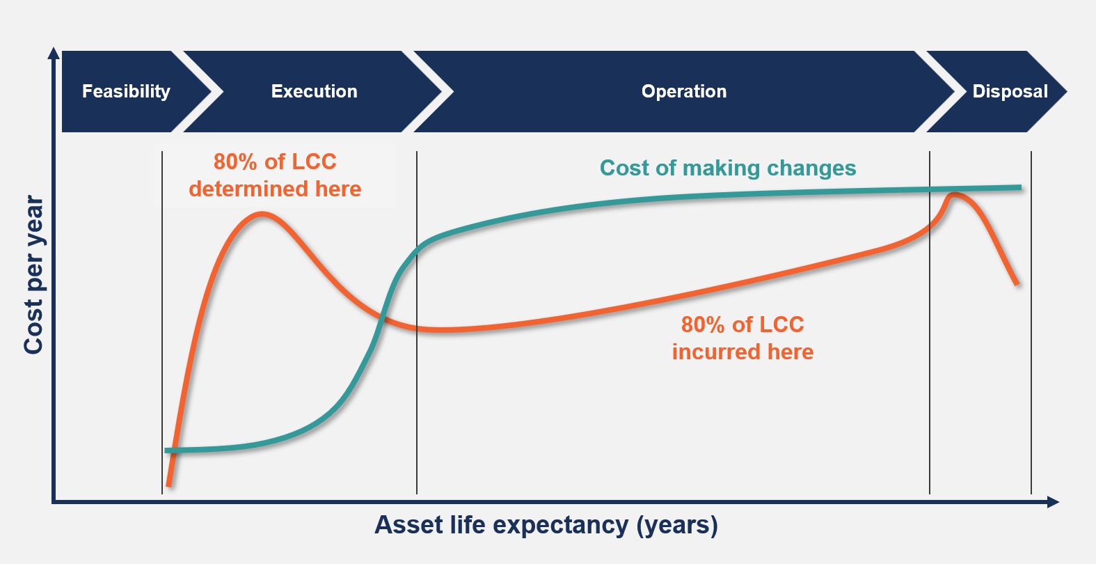 The value of operational readiness and its sub-set of maintenance readiness in an asset’s life cycle should not be underestimated. The application of the maintenance readiness process and commitment by all stakeholders in the early stages of the process can have a vast impact on asset life cycle costing. This is well illustrated in the graph below.