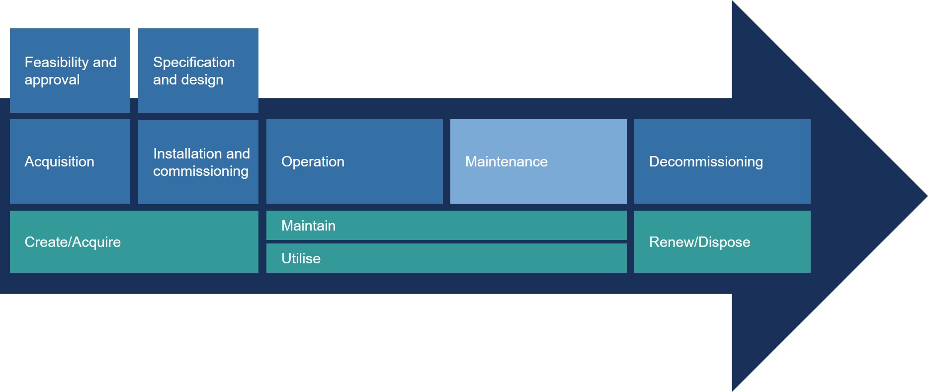 - Create/acquire | You ensure that the demand is well understood (especially long term). The specified asset must be fit for purpose, and the operations and maintenance teams must be ready to use and maintain the asset once it is commissioned.