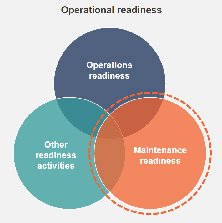 When we consider maintenance readiness, we focus on the maintenance and reliability-related activities within the operational readiness landscape. Maintenance readiness includes the processes and activities required to ensure that enterprise assets are designed fit for purpose and are ready to maintain at project handover.